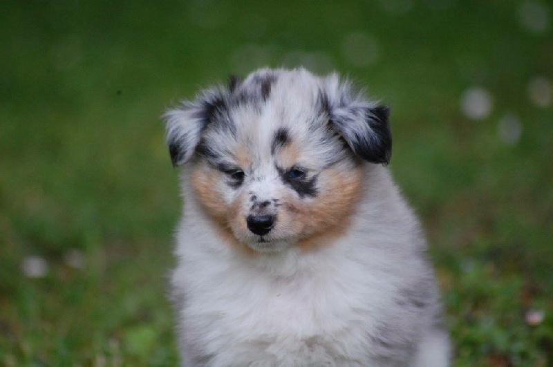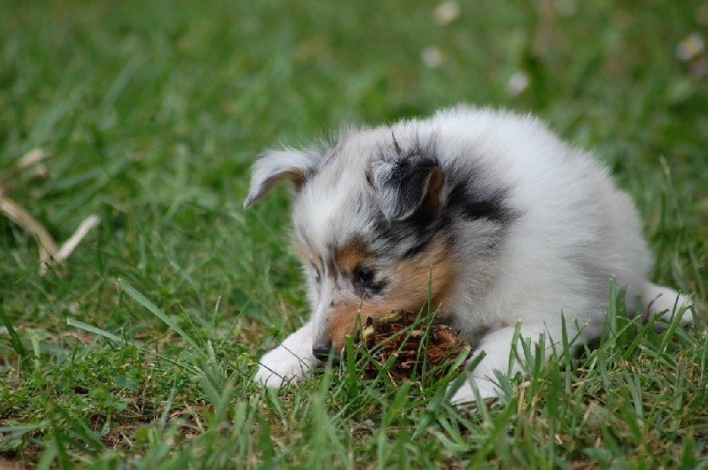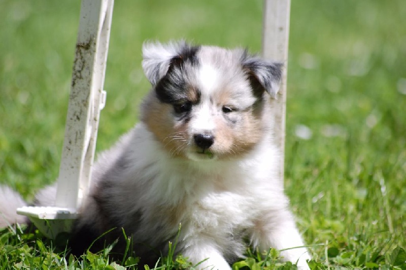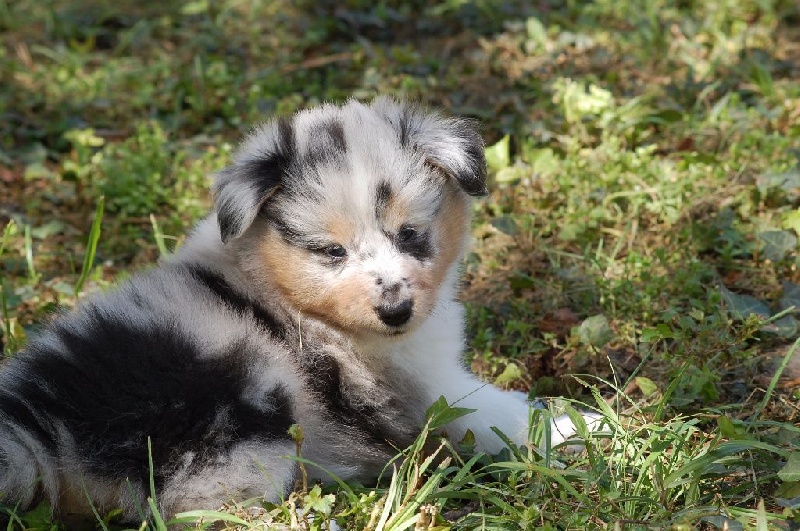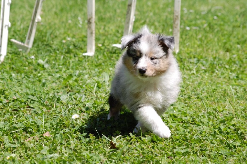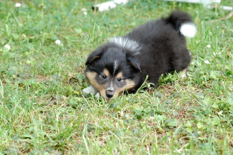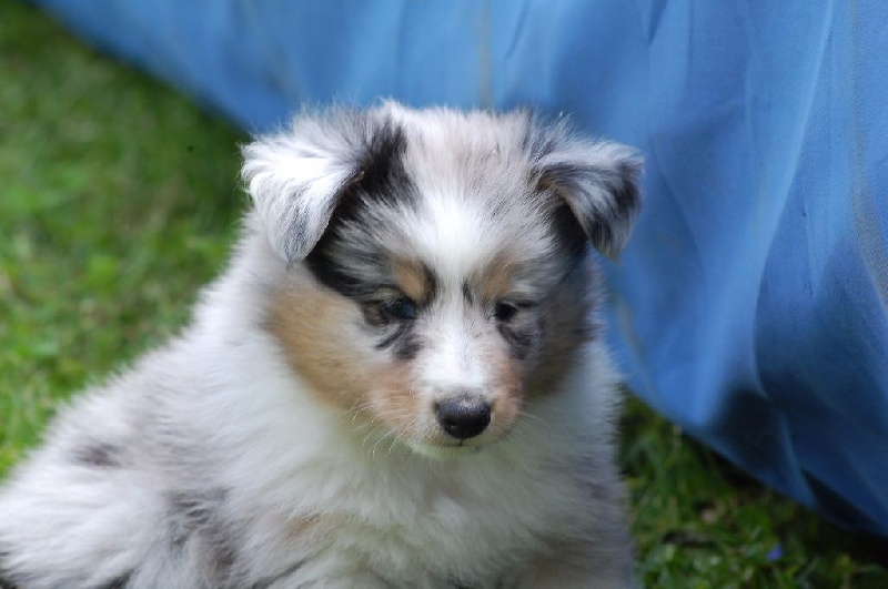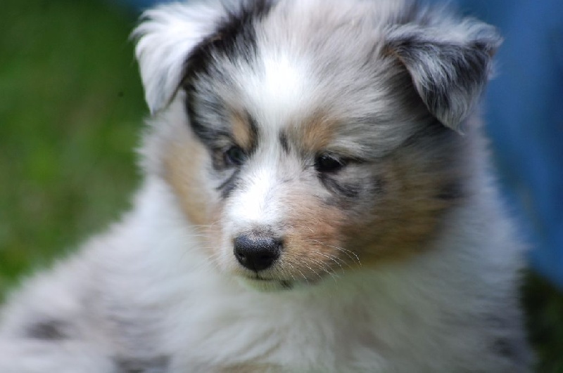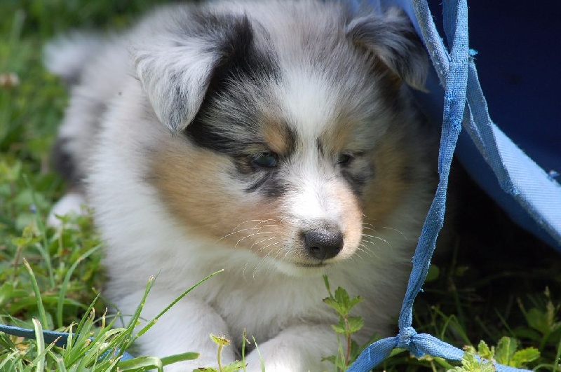 Mâle bleu né à 8h55 à 220gr, un très gros collier blanc ainsi qu'une belle liste blanche. Photos à 6 semaines. 4ème et dernier mâle arrivé, c'est un petit rigolo ! il communique beaucoup par le jeu, se fait entendre par le jeu, et règle tous les conflits par le jeu ! c'est un vrai petit pitre, quand on lui cherche les noises il le prend à la rigolade et l'affaire est dans la poche ! il sait être aussi un parfait petit chien trop trop trop câlins !